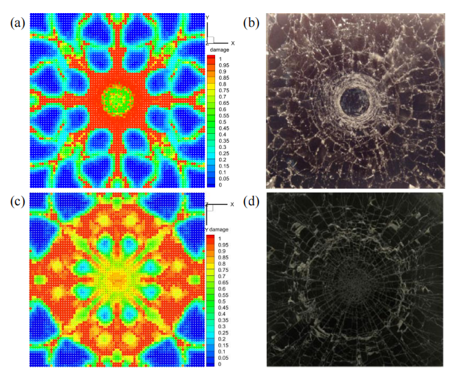 (a)通过模拟得到的前表面损伤轮廓;(b)实验中观察到的陶瓷板前表面的裂纹模式;(c)通过模拟得到的后表面损伤轮廓;(d)实验中观察到的后表面的裂纹模式。