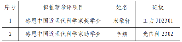 物理与力学学院第八届感恩中国近现代科学家奖助学金推荐名单公示 发布时间:2025-10-13 根据学校《关于开展第八届感恩中国近现代科学家奖助学金评选工作的通知》要求,经学生本人申请,学院评审小组结合学生的学习成绩、综合成绩、在校表现、思想品德等情况进行综合评审,按照公平、公正、公开原则确定了推荐名单,现将推荐名单予以公示。公示期从2025年10月13日至2025年10月15日,有异议者,请于10月15日下午17:00之前以书面形式实名向学生工作办公室反映,联系电话:027-87650356。 武汉理工大学物理与力学学院2025年10月13日