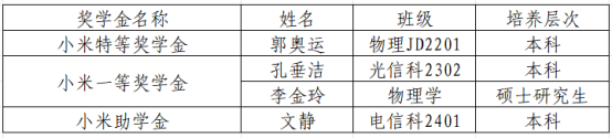 物理与力学学院2025年“小米奖助学金”推荐名单公示