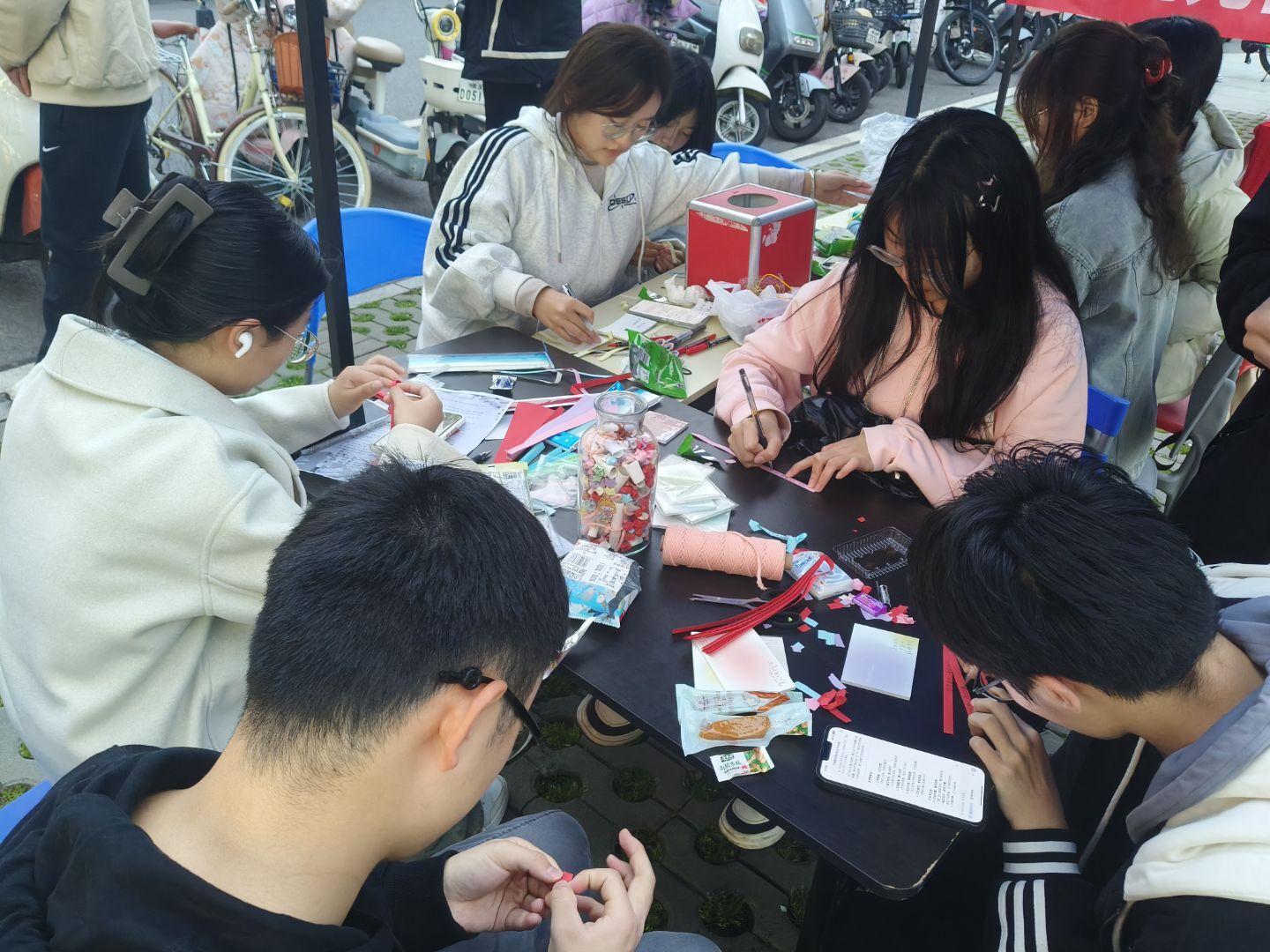 20余名“星星之火服务队”志愿者为活动提供全程保障。据队长宋静怡介绍,团队提前一个星期进行筹备,所有材料均符合绿色公益标准。活动期间,布置组负责现场车辆疏导,确保食堂周边通行顺畅;摄影组全程记录活动精彩瞬间,捕捉到许多参与者专注制作的笑脸。