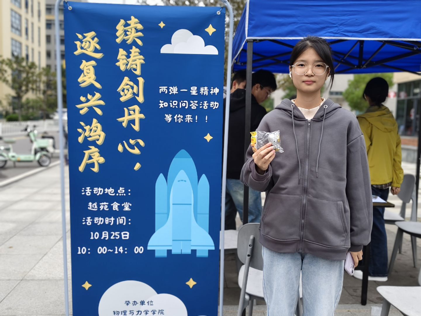 与此同时,在礼品抽奖过程中,志愿者们结合明信片上的图画与“两弹一星”纪念徽章,为参与同学讲述那个艰苦年代里,科学家们用算盘演算数据、用密码传递信息的艰难研发故事。参与者们在珍贵的历史图片前凝神沉思,仿佛思绪也被拉回了那个热血沸腾的红色时期。而印章上生动形象的导弹发射图案,更让同学们在视觉感知中深刻领会到两弹一星精神的传承意义。